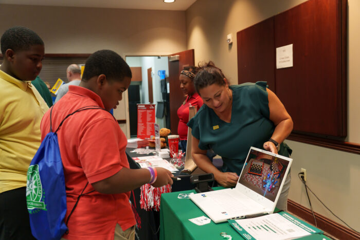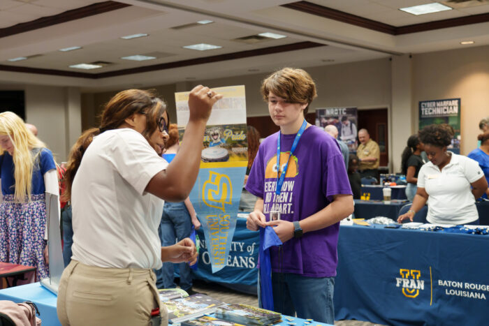Excited conversation filled UVA’s conference center as students and families engaged with the 27 vendors set up throughout the day. The recruiting representatives included career options such as the Paul Mitchell School, the Baton Rouge Fire Department, and the U.S. Navy. More than 20 colleges and universities such as Louisiana State University, Louisiana Tech University, and Delgado Community College were on site. Attendees could also meet with the Louisiana Office of Student Financial Assistance to ask questions.